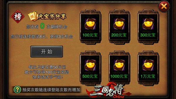 在一般的任务升级过程中,玩家将会免费获得系列元宝。有了系统赠送的第一桶金之外,你就可以参加“元宝齐分享”活动,百分百中奖,每次最少也有100元宝,最高可达10000元宝。连续登陆游戏的天数越多,获得抽奖次数就越多,获得万元大奖的机会自然也就更大。