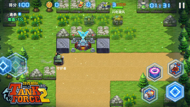 还记得那种跑的飞快的老鼠一样的坦克吧?消灭它们最好的办法就是一左一右堵住它。如果和小伙伴配合的好,《坦克部队2》中同样能实现这个场景。比如上图中的闪电旋风和钢铁侠,各自吃了强化道具之后,一个化身激光炮,另一个化身双筒坦克,一左一右堵住关键路口,再厉害的敌人也只能束手就擒!