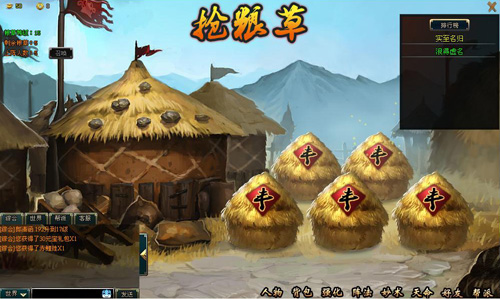 玩家达到11级后自动开启该系统。在界面右上角点击【抢粮草】按钮,便可进入抢粮草的场景中。进入场景后可看到共有5堆粮草,每堆粮草都有1个守粮统领和4个守粮卫兵进行把守,每成功抢夺一个粮草便可获得海量经验——所以抢粮草是武将后期升级的最佳途径。