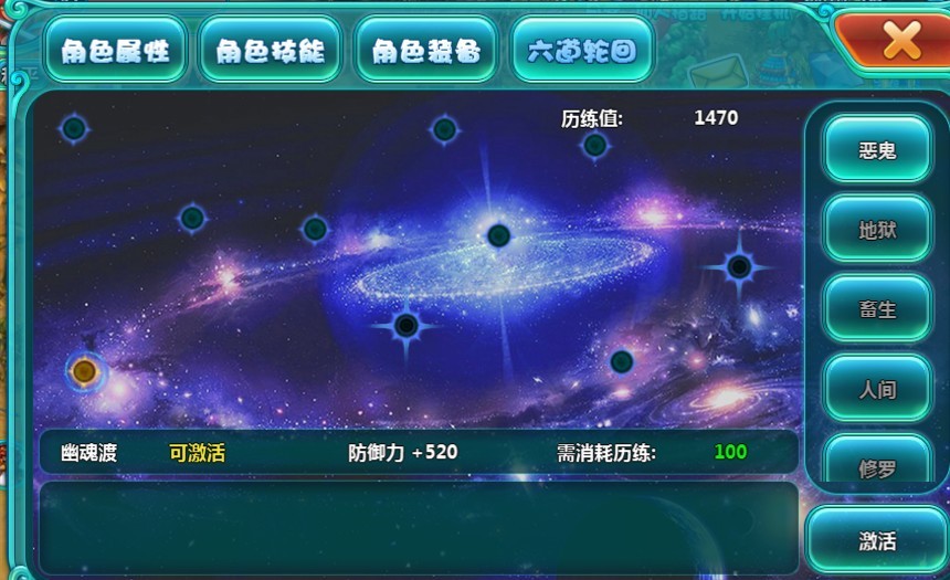激活星位需要消耗一定量的历练值,每个星位只可以被激活一次。激活前置星图后,才可以激活下一阶的星图。星点激活后,星点所附带的属性对玩家可立即生效。玩家的信息界面星图激活状态有三种:未激活、可激活和已激活,激活消耗处显示要激活该星点需要多少历练值,玩家修为足够则显示为绿色,不足则显示为红色。