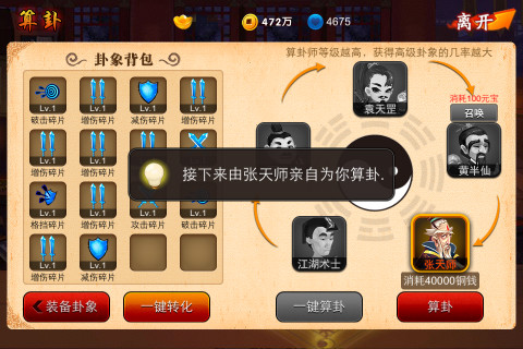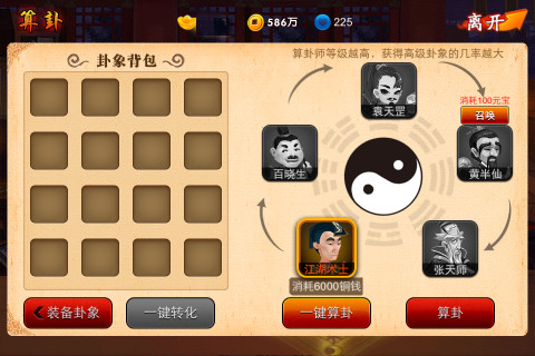 黄卦除了游戏内一些抽奖活动会比较大几率爆出外,唯一的途径就是只有算卦了,目前来看,张天师是出黄卦的最大贡献者,至于黄半仙,暂保留态度。除了花100元宝召唤黄半仙,百分之80以上几率会出现张天师外(土豪大法暂时不做评估),唯一的途径就要是刷铜钱了。用铜钱刷出袁天罡后,有一定概率刷出黄半仙,然后刷出张天师。
