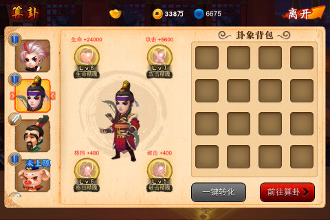 《囧西游》35级完成主线任务后开启算卦系统:卦象分为4个等级,按照不同颜色区分,分别为:蓝、紫、红、橙;每种卦象都可以获取卦象经验进行升级。算卦系统是《囧西游》中提升战力的重要途径,它为每个伙伴提供多达九种的属性加成,伙伴攻击高生命值低、格挡和暴击不够、破击和抗暴能力弱,有了算卦系统,这些都没问题,合理地使用算卦系统装备卦象,能让你在通天宝塔、各类副本以及竞技PK中所向披靡,傲视群雄!