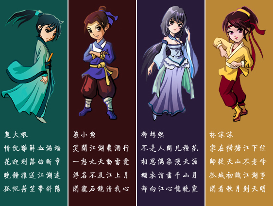 首先,跟大家见面的是4大主角——楚大虾、燕小鱼、柳嫣然、林沫沫。这4大主角虽然年纪轻轻,但练武资质都属江湖奇材,一套无名剑法练到极致也都足以傲视江湖。开帮立派与众多江湖名侠联手,更是无往不利。