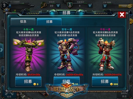 《联盟战争》全新英雄玩法推出五种不同品质的英雄选择,并通过招募界面进行抽取。“十年一遇”、“百年一遇”、“千年一遇”这种战5渣的介绍一点也不酷,但是胜在够简洁明了,其中“千年一遇”的英雄最为给力,最有几率获得高品质英雄!当然,要想获得“千年一遇”的人才也需要付出相应的勋章,而勋章则可以通过打副本和平日活动免费获取哦!