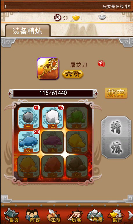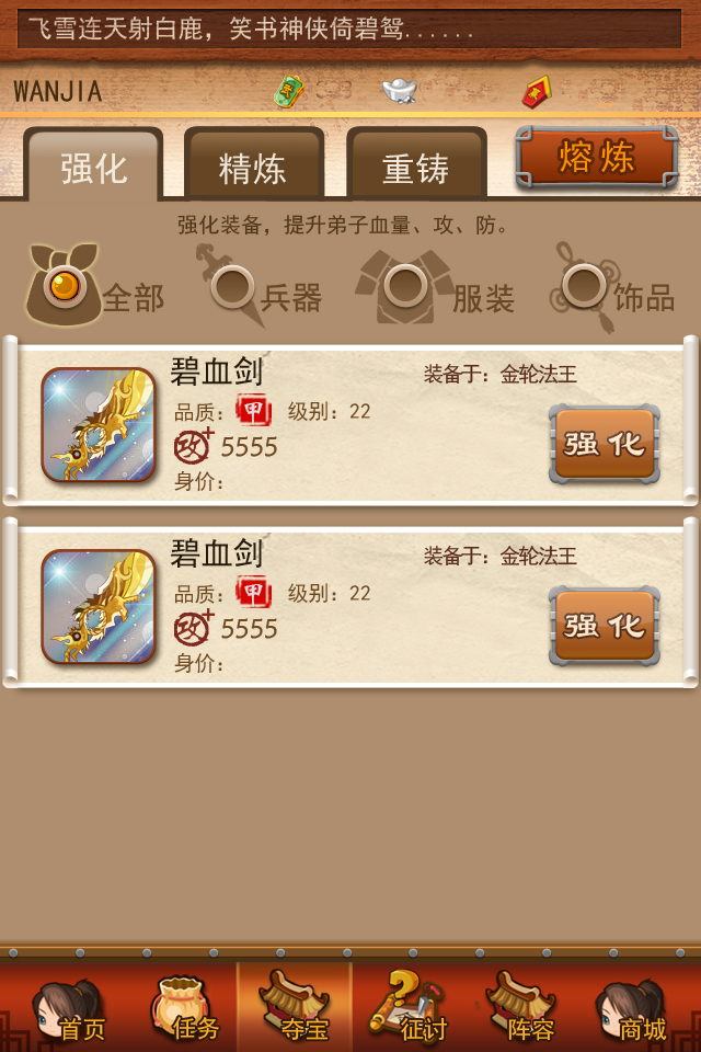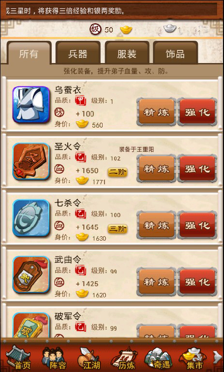 《大掌门》的装备类型分为武器、防具和饰品三种,分别增加弟子的攻、防和血,相同部位的装备只能穿戴一件。装备目前可通过两种方式来进行属性加强,分别为“强化”和“精炼”。强化需要消耗银两,强化的等级与掌门等级有关,最高不得超过掌门等级的3倍;“精炼”需要消耗精炼材料,精炼材料一共有九种级别,精炼后的装备属性将得到大幅加强。