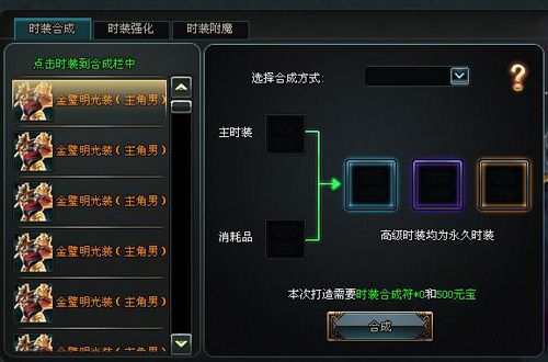 打造一件极品时装,你要做的第一步就是先合成高级的时装。只有本身属性上佳的高级时装才具有更高的提升空间。当然,如果你本身阴差阳错地(或者财大气粗地)拥有了数件一模一样的时装,那么时装合成就绝对是你的不二之选!(你也可以每天穿一件来显摆自己的财力,凸显自己的NB。)