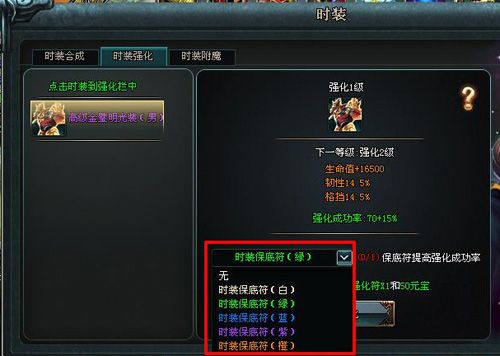 打造极品时装的第二步就是时装强化了。高级时装将按照等级分为1到10十个等级,等级越高则属性越强。同时,强化过的高级时装还拥有逆天的 额外属性附送。时装的强化需要消耗神秘的魔界之物——【时装强化符】。任何情况下擦枪走火都在所难免,遑论是强化时装这样的高端工作。每次升级你都会有一定的升级失败概率,但这时的失败不会对你造成太大损失,除了时装强化符被扣除外,时装现有的等级是不会下降的。当然,为了保证升级的成功率,你也可以购买更加罕见的神器【保底符】。
