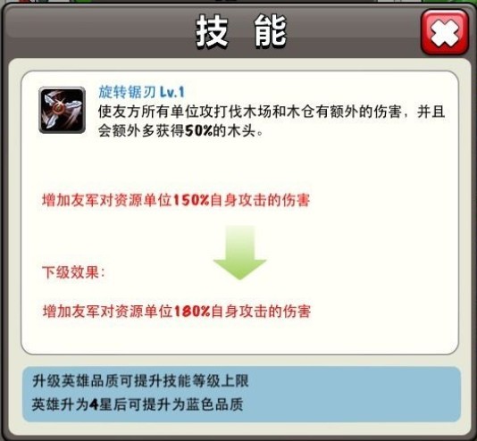 旋转锯刃:使友方所有单位攻打伐木场和木仓有额外的伤害,并且会额外多获得50%的木头。