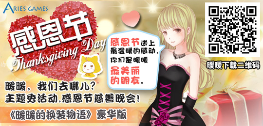 感恩节就快到咯,快为暖暖准备衣服!下载《暖暖换装物语豪华版》搭配好主题服装,点击游戏内拍照,图片分享到微信好友“Ariesgames微活 动”及你的朋友圈,即可参与活动!赢取我们精心为你准备的感恩节礼物!