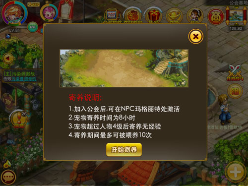公会萌宠园,可以寄养宠物,获得经验及技能点,促使宝宝快速成长,同时可以通过喂养自己和其他成员的宠物获得公会贡献的提升。