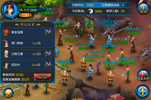 江湖大逃杀,考验的是玩家真正的实力与技巧,比拼的玩家的操作和意识。每天的11:55分,等级达到40级的各路武林高手,将齐聚一处行动范围限制的、风景优美的地方--光明顶,为稍后的江湖大逃杀作最后的精心准备,该加血的加血、该补蓝的补蓝、加攻加防加属性,为了瓜分最后的终极奖励,他们将不惜一切代价互相击杀,直到12:40还能站在光明顶上。谁,会是真正的盛世之王?