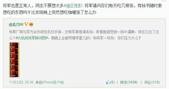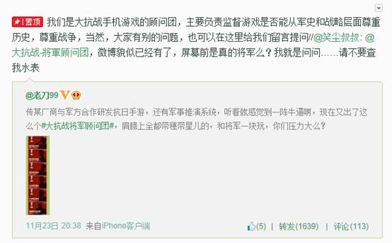近日,游戏行业著名“舅舅党”老刀99再次爆料,称某游戏厂商与军方合作研发抗日手游,并且爆料军方人员均为少将以上军衔,堪称“将军顾问团”,更是有图有真相的发布了将军们的剪影作为微博配图。