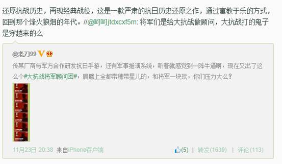 从微博的图文爆料和将军顾问团的主动回应显示,将军顾问团参与的正是中青宝近期即将面世的红色手游《大抗战》项目组,经采访,中青宝市场部经理回应:“将军顾问团是真实存在的,但他们并不是为我们的产品代言,而是接受我们的邀请担任军事军史顾问,确保在历史和战术层面帮助我们还原真正的抗日战争历程,对我们进行指导……而且,与现阶段饱受争议的抗日神剧不同,有了将军顾问团的指导,我们的《大抗战》才能更加的贴近史实,更加的还原真正的战争环境”