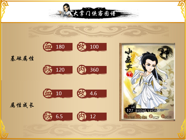 “北方有佳人,一笑倾国再笑倾城”,关于小龙女的冷艳美沐沐在此不再赘言,看过小说和电视剧的宅男一定懂得,沐沐今天主要给大家分析下小龙女弟子的属性和培养方向。从上图我们可以看到,小龙女初始属性和成长属性都比较的出色,其中最大的亮点就在于其防御,高达120的初始防御冠绝大掌门众弟子,防御成长6.5大于段誉的5.8,同级别裸装备的小龙女是大掌门防御最高的弟子,外表柔弱的女子却是最强肉盾的存在哦!