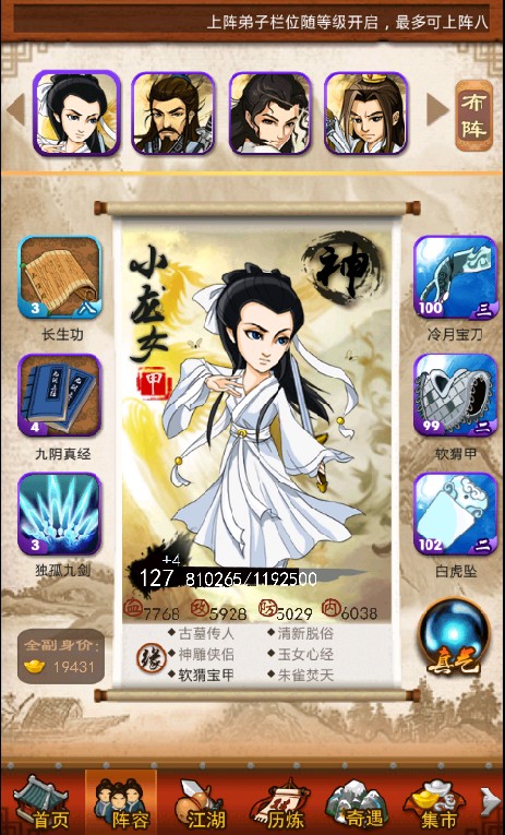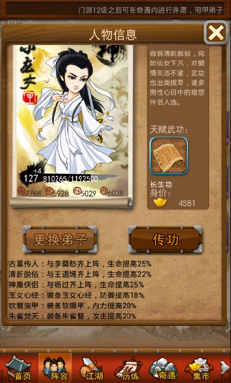 小龙女的缘分主要以血缘为主,其中与李莫愁和杨过的配缘较易获得,与王语嫣的缘分较难获得;装备配缘软猬甲和朱雀簪比较难获得。小龙女的天赋武功是乙级的长生功(被动),小龙女的闭关效果是闪避,作为防御性弟子,这个属性还是不错的!加血、加闪避小龙女配缘及天赋武功特性继续巩固了其最佳防御弟子的地位。