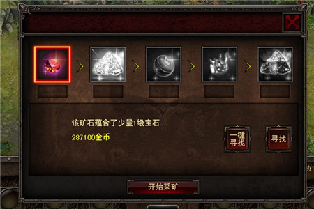 在主界面的日常活动中,找到光环提示的挖金矿图标,点击进入即可开始挖矿的准备工作。点击界面下方挖矿按钮,可调出 寻矿界面。矿产品质从低到高总共分为五种,晶石、银矿、宝石、水晶和金矿,越高级的矿产产出的金币和宝石等级就越高。当矿产品质不合心意时,玩家也可以通 过点击寻找按钮来更换矿产品质(成功则提升一级矿产品质,否则减少一级),矿产中包含大量金币以及宝石,开采高级矿脉,更是可以得到高级的稀世珍宝。
