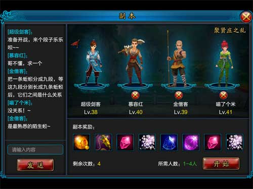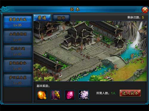《叫我大侠》共有五大副本:聚贤庄之乱、血战光明顶、楼兰之谜、勇闯绝情谷、梦回黑木崖。玩家达到35级之后便可进入第一个副本,每5级开放一个新的副本,每个副本都有普通和困难2种模式。普通模式为单人副本,没有限时,怪物数值较低,BOSS的血量不高也不会有血量继承;困难模式为多人副本,有限时,怪物数值较高,目前最高支持4人组队,玩家可以根据自己的战力挑选合适的伙伴踏上征战副本的旅程。不过,玩家若想挑战困难模式,则必须通关普通模式。