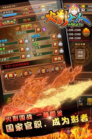 另外,超大型国战,没有实力的精英忍者挑起担子怎么可以。《火影大人》每个国家都设有不同的职位的“官员”带领大家参与战斗,实力从上至下依次为:国家首领“影者”,一左一右两大护法和四位长老。官员除了能够取得全国忍者的仰慕与爱戴,更有几率获得限量卡牌六道仙人、宇智波斑和波风水门。