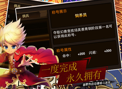 在《格斗之皇》的成就系统中包含数十种不同成就分类,无论是副本狂人,还是竞技场大师,都能获得与自己实力相当的称号。小编在此特别说明,你获得的所有称号都将是永久的,譬如下面这个【饲养员】称号,只要你曾经夺取过英勇青铜阶段的幻兽竞技场第一名,那么即使你将来不再是第一名,这个称号也会永久保留,属性什么的,自然也跑不了啦。