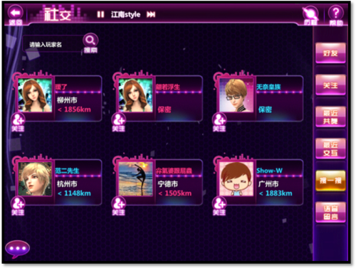 汉子们可能就会吐槽了,这样真实的社交功能岂不是耽误我们和妹子的友好交流?别担心,游戏内置“摇一摇”功能,帮你随时随地快速定位周围在线的美女帅哥们,想找女神想找好基友都不是问题!别羞射,冲田杏梨在《人人秀舞》等着你呢!