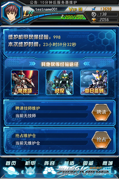 想不用战斗就能获取超高经验吗?机甲维护可以为您实现。机甲维护分为三种模式:普通维护、机师维护、抢占维护。普通维护点击开始后,即可马上进入维护状态,当然这种付出最少也最安全的维护模式,其所获得的经验值也是最少的。机师维护是通过消耗银币,来聘请机师来对机甲进行维护,由于要消耗银币,所以机师维护所获得的经验值,也是最高的。第三种是抢占维护,需要玩家去抢占维护仓才可对机甲进行维护,换句话说就是抢占维护仓的PK大战!要想占领最好的维护仓,那么就要去打败维护仓里的其他人。这倒也符合机甲游戏的味道,资源嘛,就是用来抢夺滴。