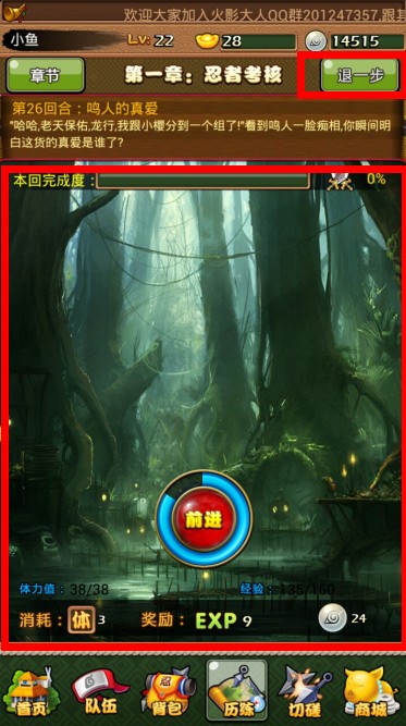 剧情是贯穿游戏的主轴,带领玩家一步一步体验游戏,因此其UI设计也是显得尤其重要。《火影大人》的剧情主要集中于历练系统,并将带玩家体验原汁原味的动漫故事。眼尖的动漫迷玩家可能会发现,在游戏历练中的背景似曾相识,定睛一看,就是原著中的场景,很有身临其境的感觉。忍一时风平浪静,退一步海阔天空,因此玩家也会发现右上角这样一个人性化按钮来方便玩家快速回到过去,并多次获得经验与卡牌,以便增强自身实力。