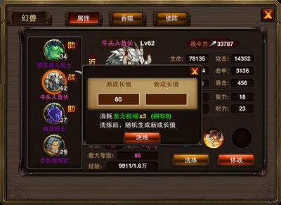 在幻兽竞技场开启的时代,有一只好的幻兽越来越重要了。如果你很幸运的得到一只稀有的幻兽,但是成长却很低,会不会让你本来快乐的心情跌到低谷呢?不用担心,在新版本中,幻兽的成长属性不再是无法改变的了,只要购买指定的成长洗练药水,就可以改变幻兽的成长。获得强力幻兽伙伴,就是这么简单!