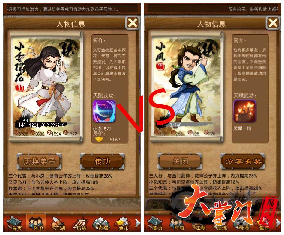 小李探花与陆小凤本是两本小说里的人物,在《大掌门》游戏中玩家可以同时把他们招募为自己的弟子,颇具趣味性。然而麻烦也随之而来,众所周知“小李飞刀,例无虚发,出刀必见血”可谓最锋利的矛;而陆小凤的“灵犀一指”可以夹住任何人的兵器是为最坚实的盾,最锋利的矛VS最坚实的盾,这场江湖高手决战颇具看点哦!