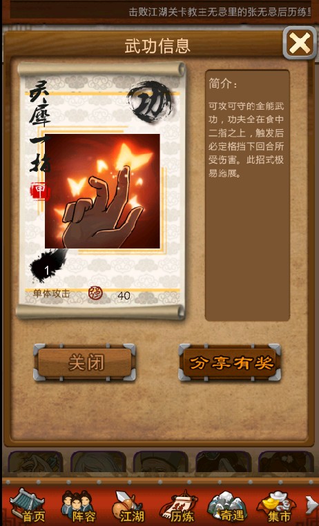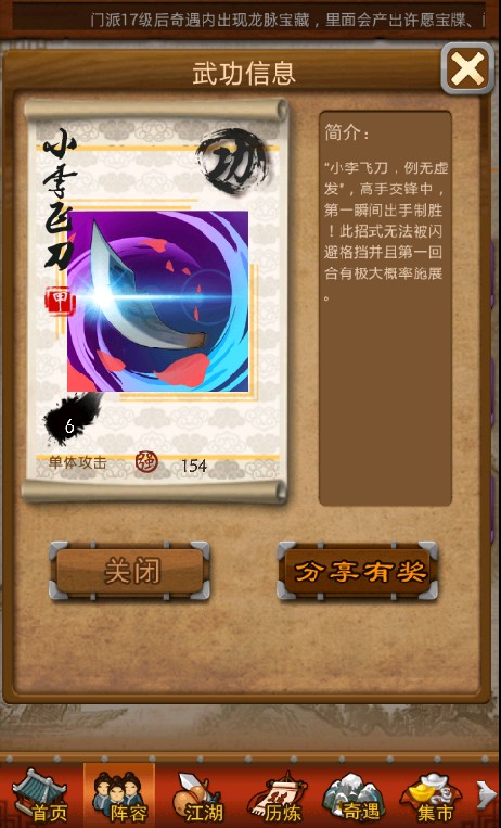 在武侠小说中,每一位大侠都有自己的绝技,比如乔峰的降龙十八掌、洪七公的打狗棒法、段誉的六脉神剑等等。在《大掌门》中,每一位弟子侠客都有与原著小说中相同的天赋武功,新弟子小李探花的天赋武功为“小李飞刀”,此招无法闪避;而陆小凤的天赋武功则为“灵犀一指”,此武功触发后不仅能对敌人造成极大的伤害,还能在下一回合的战斗中必定格挡敌人的杀招,刀光剑影后谁能活下来,有兴趣的玩家不妨下载游戏大战一场!