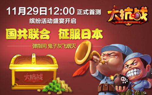 中国第一抗日手游大作《大抗战》今日(11月29日12:00)正式首测,一起进入游戏,拿礼品杀鬼子,开启掌上抗日之旅吧!