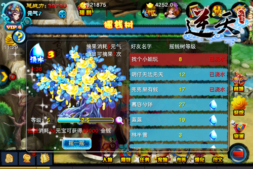 参加摇钱树活动可以获得大量的游戏币,每天可通过消耗元气摘取金银果20次,每次摘果都可获得可观的金钱奖励。摇钱树通过浇水来升级,摇钱树等级越高摘取金银果获得的金钱也越丰厚。同时也可以通过消耗元宝“摇一摇”摇钱树获取大量金钱。另外,为好友的摇钱树浇水也可以获得金钱哦,这么有爱的事情,相信应该没有人会不做吧~