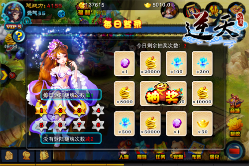 首次登录游戏可获得2次免费翻牌机会,点击待机界面活动按钮,进入每日登录中翻牌即有几率获得元宝、金钱、修为值和元灵值等众多珍稀奖励哦!连续登陆天数越多,系统奖励的翻牌机会就越多哦!