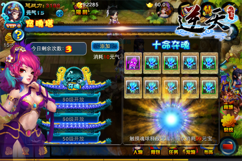 宠魂塔是宠物宠魂产出的特定地点。玩家根据自升等级,可以选择适合自己的级别层次进行挑战。挑战胜利后,你可以获得大量的宠魂。挑战的怪物等级不同,获得的宠魂质量也不同。如果想获得高等级宠魂,则可以在挑战之前进行怪物刷新,而每日免费挑战次数使用完,还可以使用元气增加挑战次数。