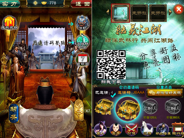 新服活动期间,通过游戏内“与微信好友玩”功能,将《一统江湖》分享给好友,成功邀请即可点亮分享图标,活动时间内不仅有大礼包奖励,更可直接领取现金!参与活动只需将截图发送到《一统江湖》官方QQ群(314634989)“活动管理员”即可!现金不限量,尽情发挥你无限的号召力,恭迎帮主!