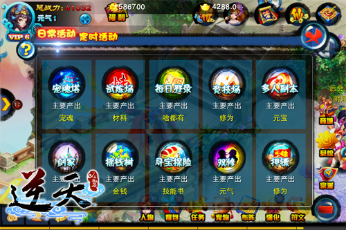 游戏中有大量的活动,比如宠魂塔,试炼场,竞技场,多人副本,剑冢,摇钱树,寻宝探险,双修,押镖,锁妖塔,寻仙问道,阵营击杀等等,还有每周按星期排行的定时活动。只要参与这些活动,将会让你收获各种奖励,乃至在游戏世界中可以纵横三界,傲视乾坤。比如,首次登录游戏可获得2次免费翻牌机会,点击待机界面活动按钮,进入每日登录中翻牌即有几率获得元宝、金钱、修为值和元灵值等众多珍稀奖励哦!连续登陆天数越多,系统奖励的翻牌机会就越多哦!