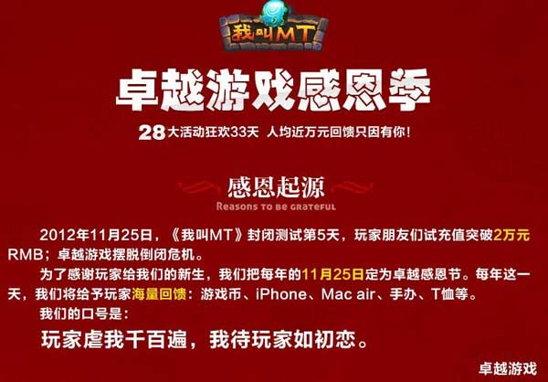 2012年11月,卓越游戏曾一度濒临倒闭,而就在11月25日那天,《我叫MT》上线测试并被不少玩家支持喜爱,日充值2万元的数据让这个公司活了下来,也让说不得大师铭记于心,并将每年的这天定为“卓越游戏感恩节”——凡节日期间,卓越游戏必拿出比平时更感恩的心,对玩家进行游戏道具、数码产品和游戏周边等礼品回馈,以表当年之恩。2013年,也是第一届“卓越游戏感恩节”,卓越游戏全体员工悉心酝酿了多达二十二项活动,并在11月25日准时为玩家呈上,诸多活动累计时间长达数月,近乎跨年,堪称游戏活动之最。