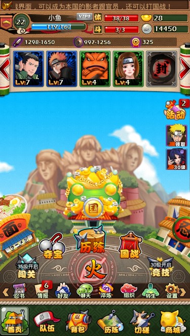 在游戏刚开始,玩家就能够选择各自效忠的国家,“火”、“水”、“土”、“风”、“雷”之一,与原著一致。主页的UI设计, 历代火影雕像就不说了,就连一乐拉面馆这一特色场景也出现在游戏当中,并能给玩家补充相应的体力,此时脑海里是不是立马浮现了一乐拉面馆老板和蔼可亲的面孔了呢~其他更多的游戏动漫细节还分别体现于剧情、忍术相生相克、装备造型相呼应等功能。
