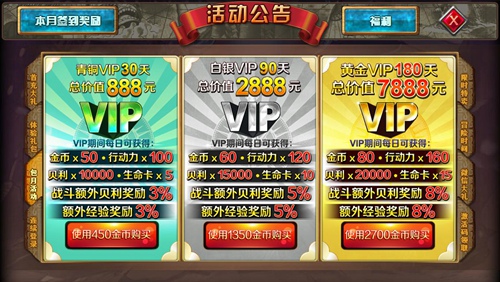 从首次进入游戏起,连续登陆3日即可获得100金币,坚持至第6天可再得250金币。再算上PPS游戏平台免费发放的新手卡,还能有118金币进帐,只要在这一周时间忍住不花,玩家可积攒到468金币,这时就可以进行一项回报颇丰的投资——拿出450金币购买30天的青铜VIP资格。除了丰富的奖励加成,每天还能轻松入账50金币。