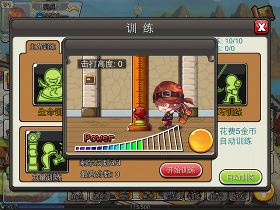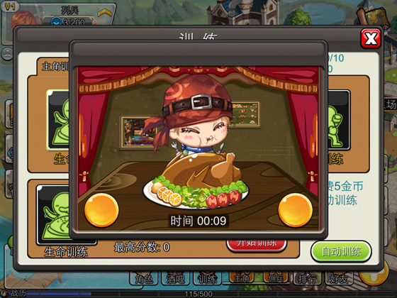 耐力训练,吃货玩家通过快速点击按钮吃烤肉,在限定时间内吃光面前的美食,获得属性加成。美食当前,吃货本性无需隐藏,快速点击按钮,释放舌尖上的诱惑。