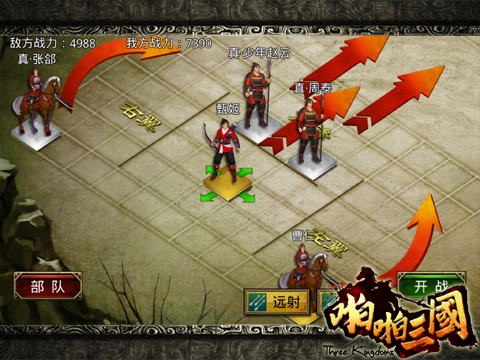 《啪啪三国》彻底颠覆同类游戏“排兵、布阵、等结果”的单线程游戏方式,除了战斗前期的武将、兵种搭配强化外,战斗过程中的随机应变以及战术指挥更将直接决定胜败——是集中全军压迫前线?是正面佯攻骑兵两翼包围?是中路空虚诱敌深入三路围剿?丰富的战术、阵型选择,让玩家彻底过一把“诸葛亮”瘾。而进入战场后,更要根据实际战况指挥各军团随机应变,充分发挥各兵种特长压制对手,直至取得胜利。