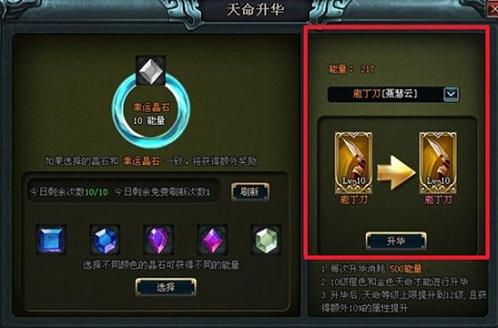 每天,你都可以获得一次汲取能量的机会。选择一颗晶石后,你将可能得到白色、绿色、蓝色、紫色、橙色五种晶石中的一种,分别对应1、2、3、4、5点能量。选择晶石就能获得对应的能量值。而被选择的晶石将会被重置。此后,你可以以一定的消耗换取额外的汲取能量机会。此外,如果选择的晶石和特殊奖励区的晶石一致,你还能获得额外的能量奖励。获得足够的能量后,你就可以选择对应的天命,完成天命升华,一日千里,彻底拉开自己与那些虾兵蟹将的距离。