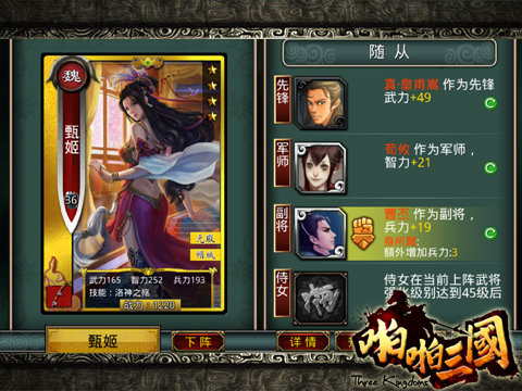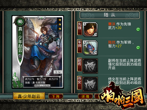 《啪啪三国》除了常规武将养成玩法外,更首创随从系统,玩家可以为自己的主力将帅配备先锋、军师甚至侍女等随从,提供全方面的辅助效果。根据三国名将的特点游戏中所有武将都对随从位置有默认适应度,比如武力高的张飞、赵云更适合做副将、先锋,智谋卓越的诸葛亮、司马懿则适合当军师参谋。不仅如此,游戏还根据三国全武将关系以及典故剧情设计有丰富的随从额外属性加成,比如貂蝉配吕布,甄姬配曹丕等等,《啪啪三国》随从系统带给你更加自由的军团组合,率领独一无二的军团一战定天下!
