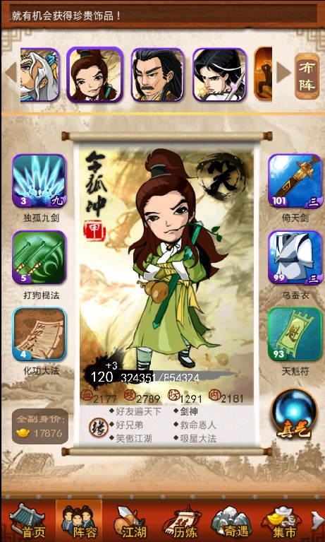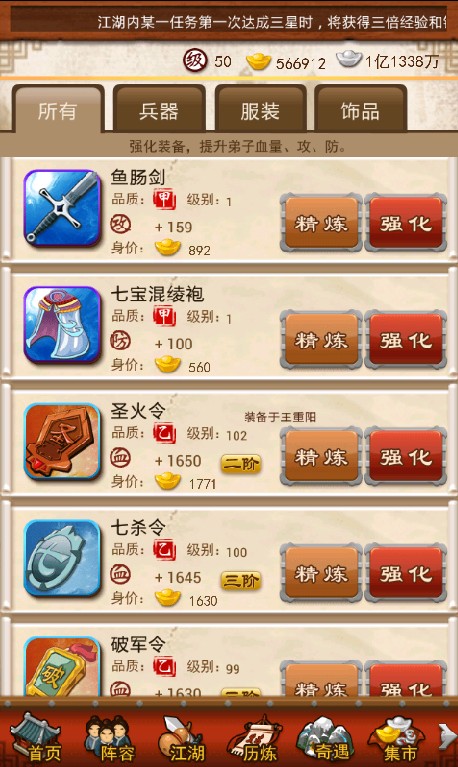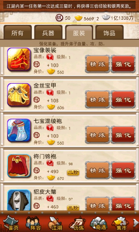 行走江湖没有一身好行头如何能行侠仗义?大掌门的装备一共有三种分别为:武器、服饰、和饰品,装备的品质有甲、乙、丙、丁四中品质,其中甲级装备属性最好。装备的获得可以通过闯江湖掉落,各种活动、或者开宝箱获得,想要成为第一巨侠好装备也是必不可少的哦!