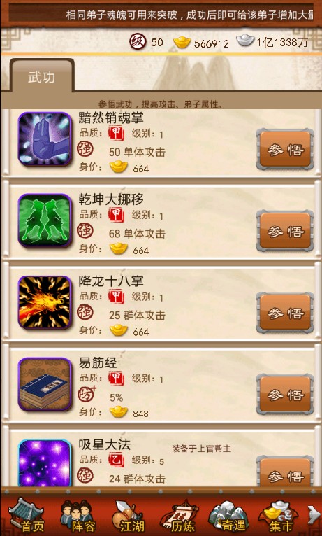 说完装备和等级接下来就要说武功了,武功是巨侠的“招牌”,就好像郭靖的降龙十八掌,张无忌的乾坤大挪移等等。在《大掌门》中每一个弟子都有自己的“天赋武功”(参考原著小说),除天赋武功外弟子还可以学习其他两种武功绝学,武功可以通过参悟的方式升级。