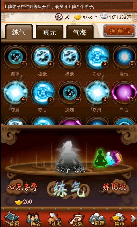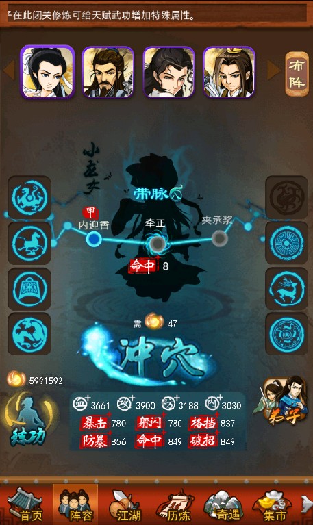 “有招无内”只是空架子而已,不堪一击。在《大掌门》中玩家可以通过打过经脉和修炼真气的方式提升实力。经脉和真气的修炼能使弟子的属性得到全方位的提升,想要快速提升实力,那就赶紧闭关修炼吧!