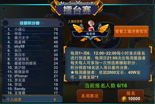 预选赛和决赛都是3轮,预选赛每轮的获胜者都有经验卡和金币奖励,预选赛冠军还能得到体力药水、100宝石和5W金币。决赛每轮能得到体力药水和宝石奖励,每轮的奖励都会增加,每周的最强者还能得到2000宝石、40W金币和至尊宝箱。还有就是每周总冠军的头像和名字会显示在擂台赛的最显眼的中间位置,这样一个在全服出名的机会摆在我们面前,还等什么?