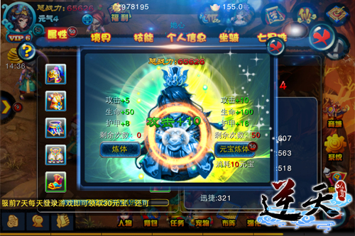 身为加入了修仙门派蜀山或昆仑的修道者,你每日都将获得数次炼体提升实力的机会,只要你进行炼体,就可以提升攻击,生命与护甲。游戏中还分为两种炼体的方式,分别是自身不依靠外力,而单独进行修炼的炼体,以及依靠元宝来强化修炼的元宝炼体。虽然每次炼体后提升的额度并不大,但只要持之以恒,每日都不松懈,那么不需要多久,你将有望修炼至实力超群的境界,纵横三界罕逢敌手,修仙修魔百战成名!