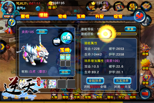游戏中也分为金钱培养与元宝培养,前者只需要消耗金钱,而后者则需要消耗元宝,当然见效将会更快。宠物潜能的培养,效果与宠物自身的资质关系很大,资质越高,就越能促进能力的培养。游戏中的宠物具有按照档次划分为3种资质,分别为绿色,蓝色,紫色与橙色,资质依次递增,尤其以橙色最好。这些仙兽萌宠,在你的给力培养之下,将有望成为你的斩妖除魔的历险中最为得力的助手!