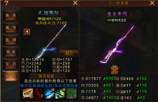 对于现在很多新玩家都倾向于提升坐骑,但是要说的是坐骑虽然战斗力提升较高,当是性价比来说是最高的。所以向各位玩家推荐的不是坐骑也不是暗器而是骑兵,骑兵无论从提升的战斗力还是样式,或者是花的价钱来说都比较划算,骑兵有一个好属性就是加攻击速度。