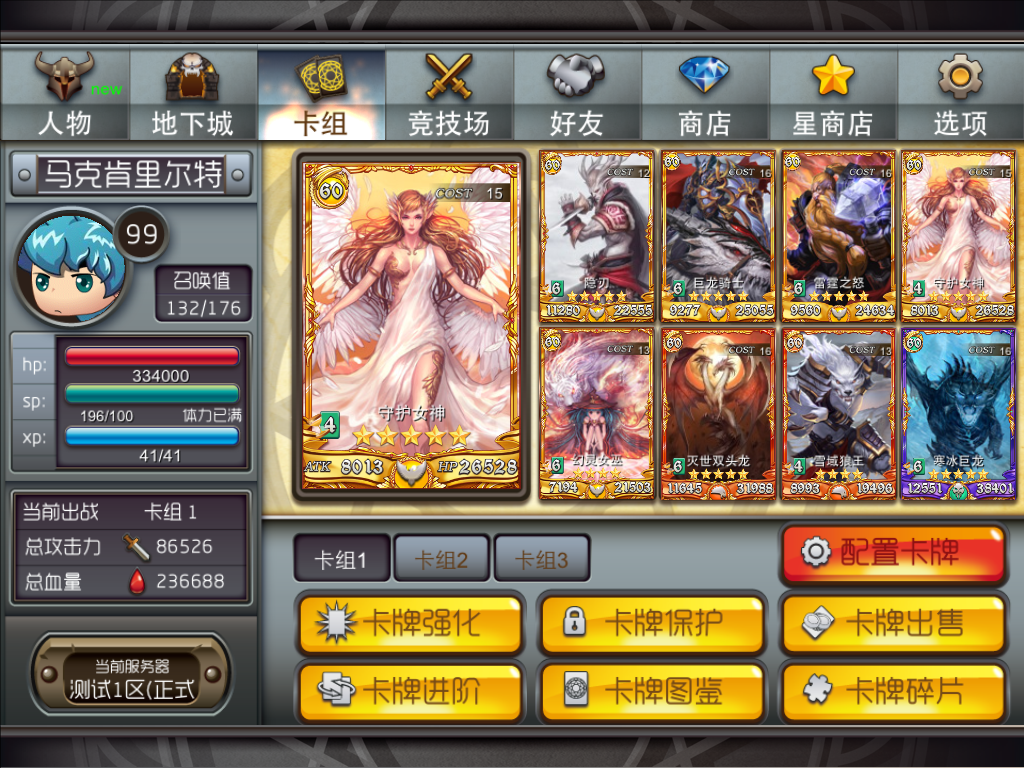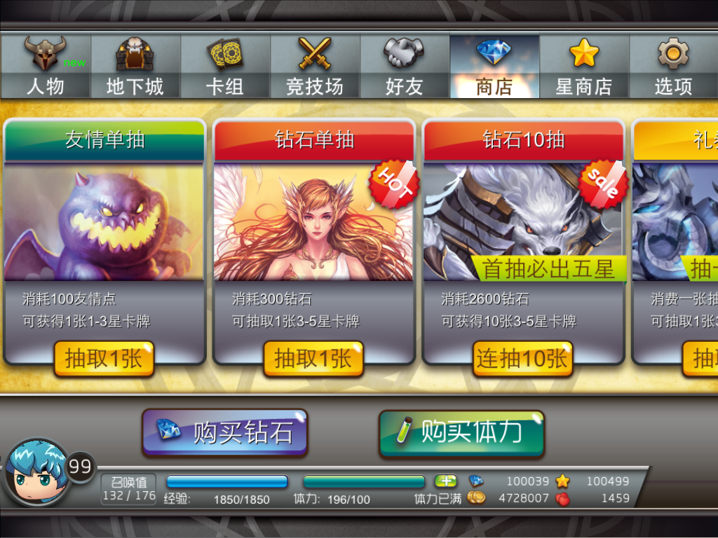 角色系统:角色系统也是《魔域战歌》的特色之一,除了卡牌之外,玩家可以通过角色系统创建、养成自己的人物,并且游戏还提供了性别、发型等RPG游戏式的角色建造方式。另外通过角色系统,玩家还可查看自己人物的等级、血量、体力等基本数值信息。但美中不足的是,目前《魔域战歌》在自建角色方面,提供给玩家的选择还有些薄弱,像人物发型等内容可以有更多的选择。